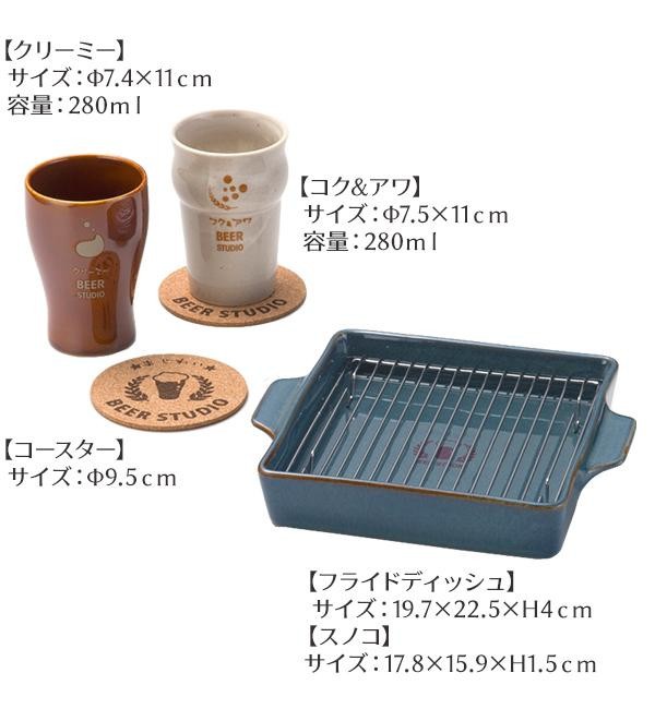 ビアカップは形状によりビールの味わいが違うので、カップをかえての飲み比べもできて楽しめます。ギフトにもおすすめです。 製造国:中国 素材・材質:ビアカップ・フライドディッシュ:磁器スノコ:ステンレスコースター:コルク 仕様:電子レンジ・食洗機:可 ※サプライヤー直送品 ご注文後5~6営業日後の出荷となります【商品名】BEER STUDIO ビアースタジオ フライドディッシュセット BE-3003A