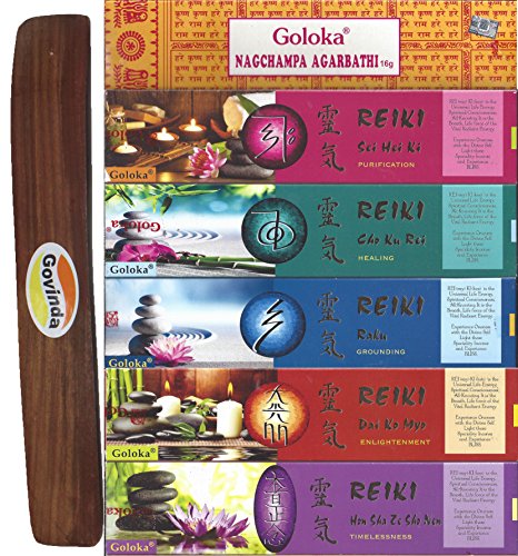 Set of 6 - Nag Champa, Timelessness, Enlightment, Grounding, Healing, and Purification with Govinda Incense Holder - by Goloka Reiki Series and Govinda Burner