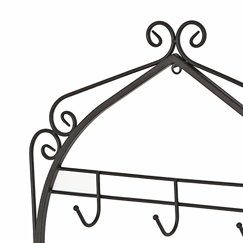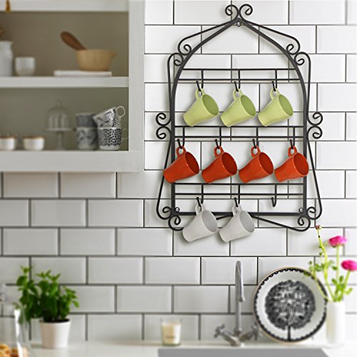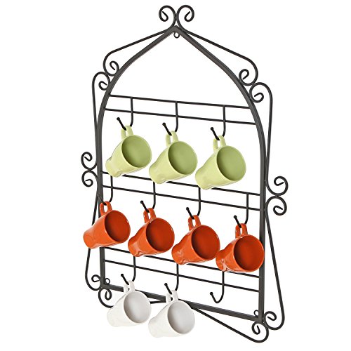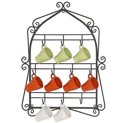 Wall Mounted 10 Hooks Mug Display Rack with Decorative Metal Scrollwork Design, Black
