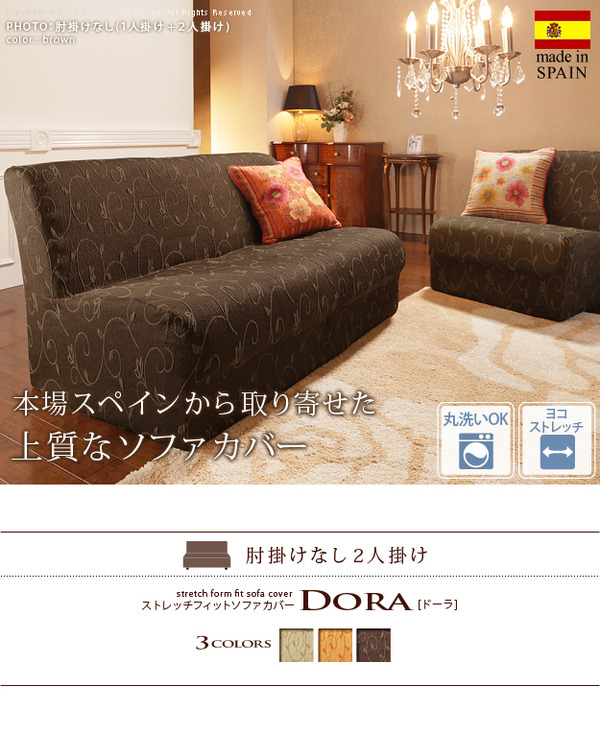 本商品はお取り寄せ商品のため、稀にご注文入れ違い等により欠品・遅延となる場合がございます。誠に恐れ入りますが、何卒ご了承ください。 また、以下の場合には追加送料がかかる場合がございます。  ・大型商品の複数購入時 ・同梱区分が異なる商品の複数購入時  【出荷目安】:3 - 6営業日 ※土日・祝除く 【同梱区分】:TS 1832 【梱包サイズ】:大型商品 【代引き決済】:不可  配送伝票の依頼主は出荷元(メーカーもしくは仕入元)名となる場合がございますので、お受け取りの際はご注意ください。   【型番】61000204  スペイン製ストレッチフィットソファカバー DORA〔ドーラ〕アームなし 2人掛け用 ソファーカバー ストレッチ 2人掛け ライトベージュ   ≪アームなし・2人掛け用≫ 商品について:横方向の伸縮ストレッチ素材で簡単キレイにフィット。ジャガード織りの高級感。柄物にもトライしてみたい!という方にもオススメ♪ 適合ソファサイズ:幅80~110cm・高さ90cmまで カラー:オレンジ・ブラウン・ライトベージュ 材質:ポリエステル63%・綿32%・レーヨン3%・ポリウレタン2%(61000204)  【特記事項】 画像のカラー・サイズとは異なる場合がございます。商品名のカラー・サイズをご確認下さい。  【ご注意事項】 本商品は、北海道・沖縄・離島への配送はいたしかねます。あらかじめご了承ください。