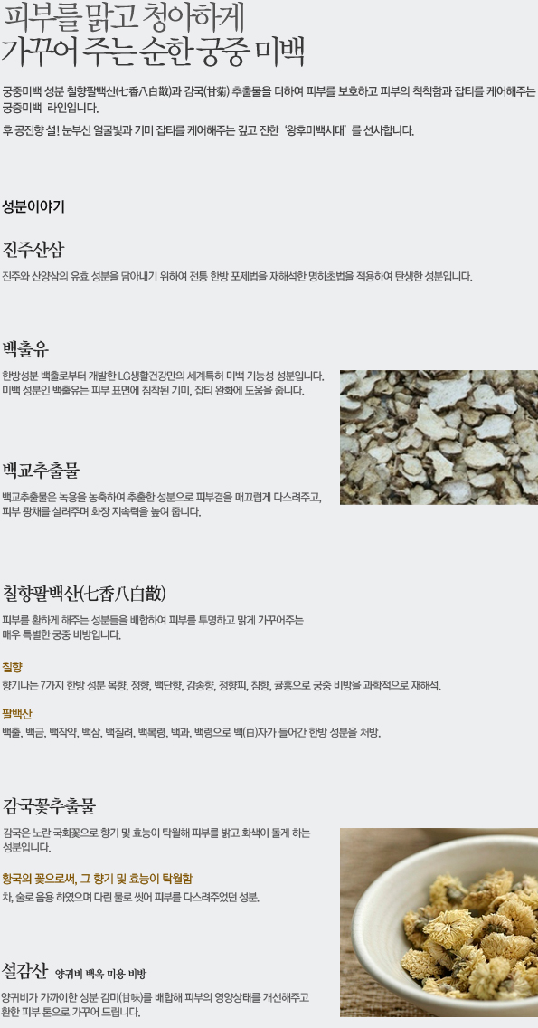 | SPF30 / PA++ Improve skin tone and texture with rich moisture for glowing skin. Day cream protecting skin from sun Chilhyang palbaeksan and Gamguk extract brighten dull skin and improve dark spot. |