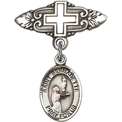 -. Title : Sterling Silver Baby Badge with St. Bernadette Charm and Badge Pin with Cross 1 X 3/4 inches