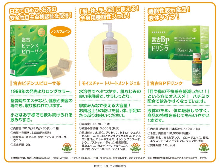 抗炎症、抗アレルギー成分である宮古ビデンスピローサ由来のカフェー酸をはじめ、天然成分を特殊抽出法で抽出したものを使っているのは、うるばな宮古さんのものだけです。