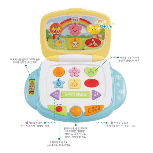 -. Feature : Mimi World Infant Pororo Computer Laugh & Learn Smart Stages Laptop For Baby and Kid Music and Sound / Playing Mate Pororo-Talking Friends Computer, The Very First Computer That Baby Will Meet, Infant Pororo Computer / When You Press The Button On The Computer, Buttons' Lights Start Glowing, Kids Can Learn Numbers, Figures, and Colors With Funny Sounds (Korean Language) / With Infant Pororo Computer, Help Your Kids To Get Confidence In Verbal Ability As They Naturally Learn Language In Routine By Repeating Various Words and Sentences / Kids Also Can Learn Simple Figures, 2 Modes Available (Singing Mode, Figure Mode), Cards Transaction Playing Is Also Available