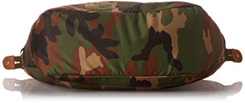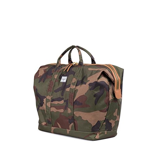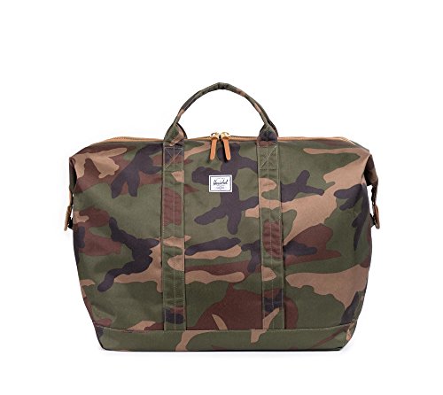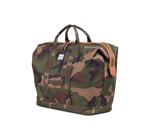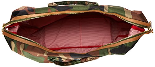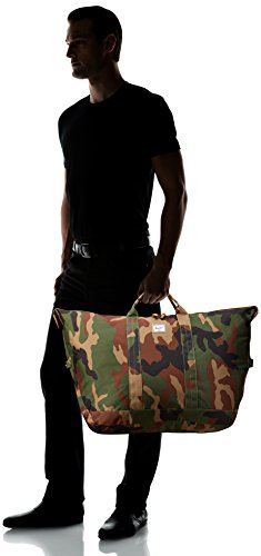 Large duffle bag featuring snap-down sides, logo patch, and signature striped fabric lining