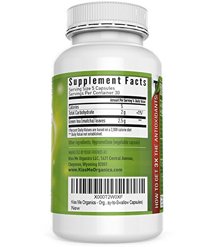 -. Binding : Misc. -. Brand : Kiss Me Organics -. EAN : 0635682809032 -. Feature : Made from 100% organic Kiss Me Organics Culinary Grade Matcha from Japan / Packed with potent antioxidants and nutrients including EGCG, vitamin C, Iron and Potassium / Contains amino acid L-theanine which enhances mood, supports better focus and memory, and provides an energy boost without anxiety / Capsules made from organic ingredients and all-natural vegetable materials / 100% customer satisfaction money back guarantee -. IsAdultProduct : 0 -. Label : Kiss Me Organics -. Manufacturer : Kiss Me Organics -. PackageQuantity : 1 -. ProductGroup : Grocery -. ProductTypeName : GROCERY -. Publisher : Kiss Me Organics -. Size : Matcha Capsule -. Studio : Kiss Me Organics -. Title : Organic Matcha Green Tea Capsule - Powerful antioxidant and energy booster- Japanese (150 easy-to-swallow capsules) -. UPC : 635682809032