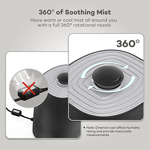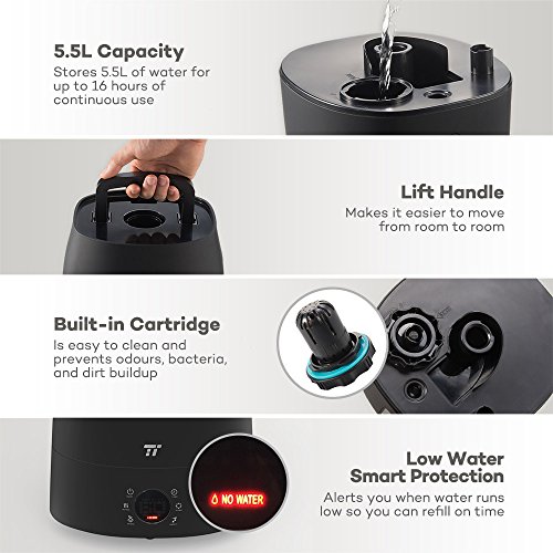 Extra Features You Need Loaded with essential features you might not know you need: A huge 5.5L capacity for up to 16 hours of mist, a full 360 degree rotatable nozzle, low water smart protection so you know when it's time to refill the tank, and a handle to assist in moving the humidifier from room to room.