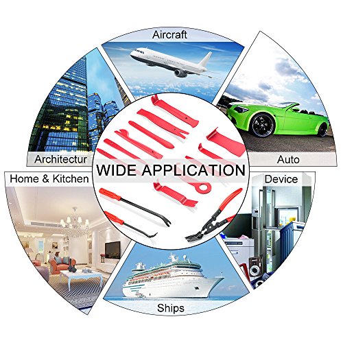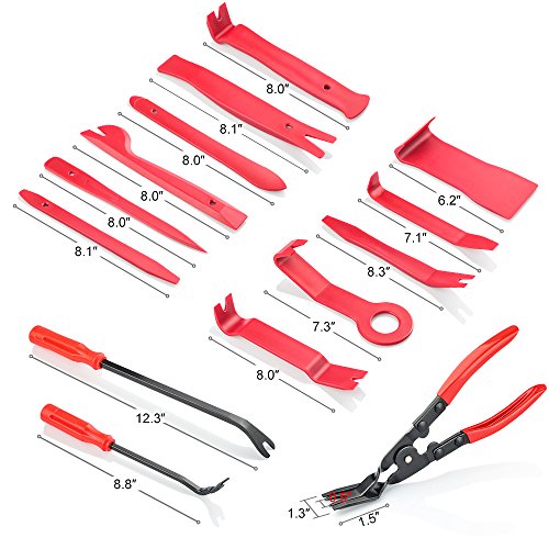 - UNIVERSAL SET - 14 Piece Trim removal tools Kit with Clip Plier Set & Fastener Remover , Works great for Automotive , Marine , or Aircraft Trim Removal including Door Panels , Moldings , Window Trims , Clips , Fasteners , Emblems , Panels , Radios , ect.