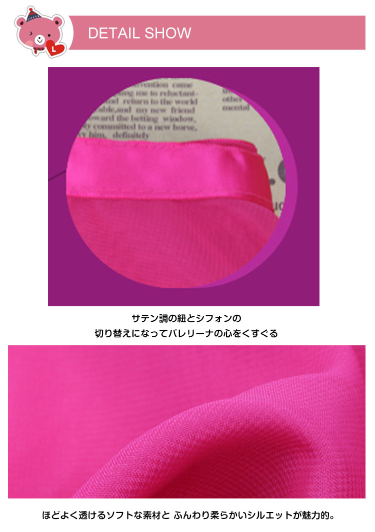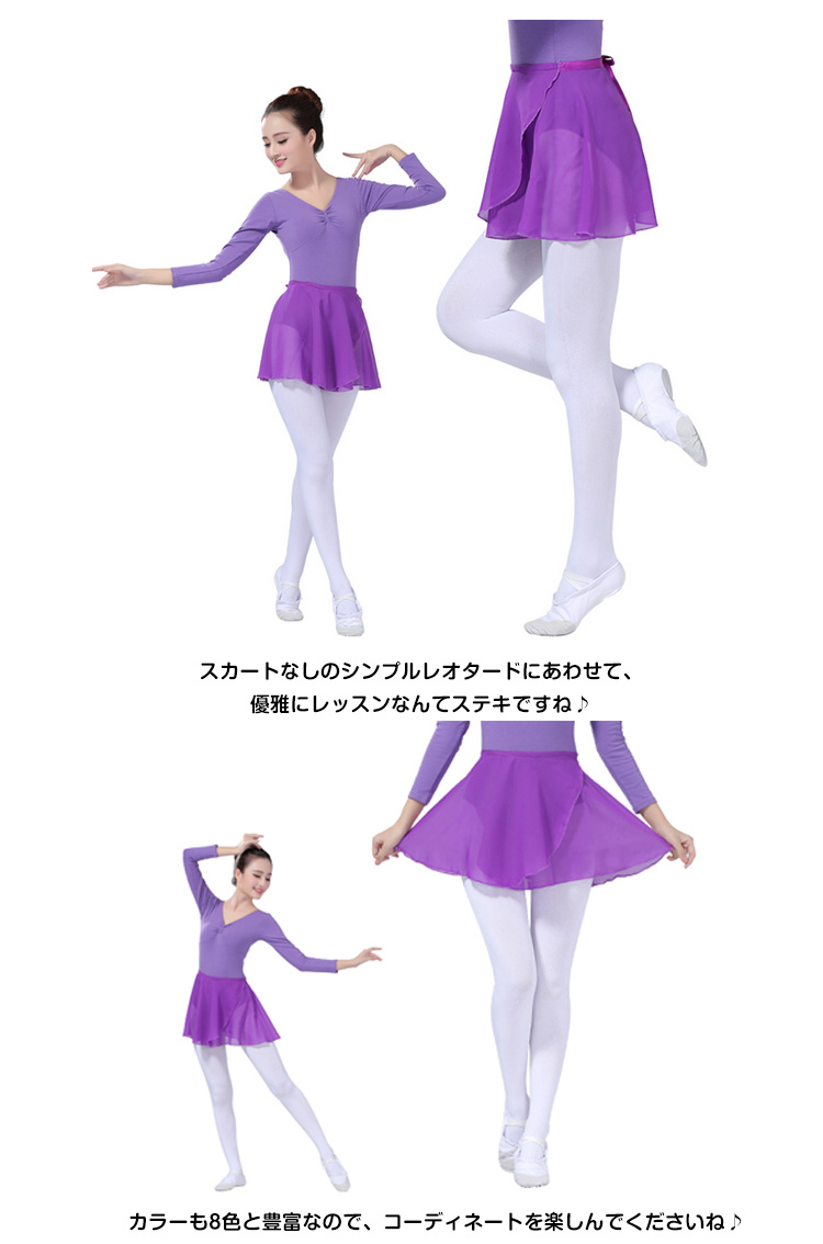 | 紐で巻くタイプのシフォンバレエスカート。スカートなしのシンプルレオタードにあわせて、優雅にレッスンなんてステキですね♪カラーも8色と豊富なので、コーディネートを楽しんでくださいね♪バレエ・ダンス他、様々な用途にお使い頂けます | |
