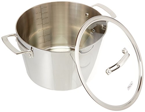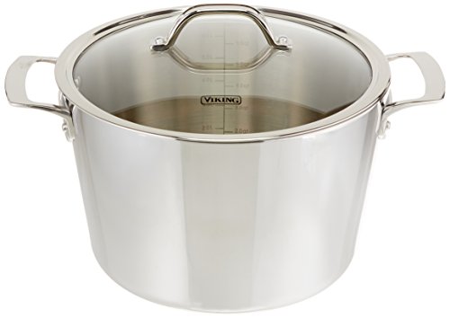 The Viking Contemporary 3-Ply Stainless Steel 8 Quart Stockpot with Lid combines a modern, Windsor pan inspired design with the exceptional performance of 3-Ply stainless steel cookware. The conical sides are angled out to provide more surface area for evaporation, while the walls retain more heat resulting in faster cooking times. The vented glass lid allows you to monitor the cooking progress of your meal while reducing the chance of boil-overs. Additional features include a unique sealed rim that completely encapsulates the aluminum layer inside the stainless steel. Internal volume markings in both US and metric units make measuring easy. All Viking Contemporary cookware combines a layer of aluminum sandwiched between heavy-gauge stainless steel. The aluminum core provides exceptional heat transfer throughout the cookware, while the magnetic stainless steel exterior makes it incredibly durable and safe for all cooktops, including induction. The Viking signature stay-cool handle is ergonomically designed for a secure grip, comfort and balance, while remaining cool to the touch. Oven, broiler and grill safe up to 600°F/315°C (oven safe up to 450°F/232°C with glass lid), dishwasher safe and features a manufacturer's limited lifetime warranty. Viking, designed to delivery Professional Performance for Your Home.Feature