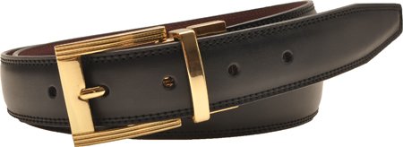 Reversible black or burgundy leather stitched edge. Gold ribbed twist buckle with single matching metal keeper