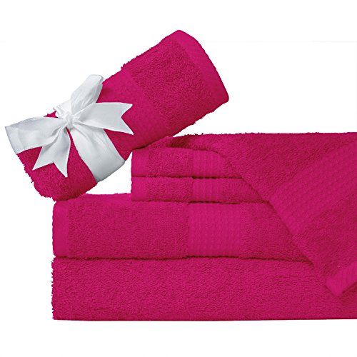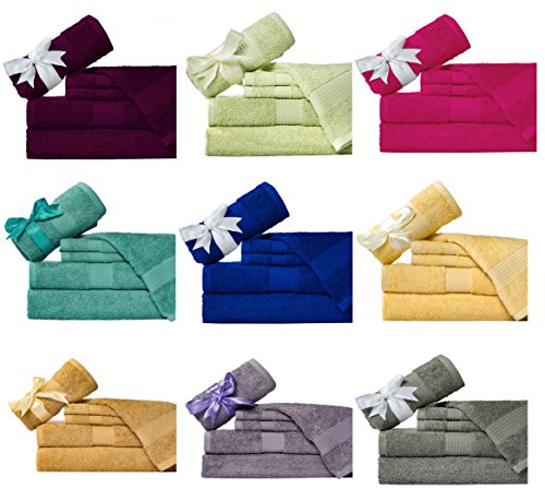 Studio : NG Publisher : NG Product Description Add a hint of color to your bathroom with the 100% superior cotton hotel spa quality 6-piece bath towel set. This set features a soft, 100-percent cotton construction and is available in a variety of colors to complement your decor. Set inculeds two oversized bath towels, two hand towels and two wash cloths. These six-piece cotton towel set brings a sense of sophistication and classic charm to any bath. Give this luxury bath towel set to a newly married couple as a gift to outfit their new home, or send your child to college with everything they need to feel right at home in their dorm bathroom. Made from 100-percent cotton, the six-piece towel set not only feels soft to the touch, but it also stands up over time and long-lasting durability. Set includes 2 bath towels, 2 hand towels and 2 wash cloths Made with 100% cotton Solid pattern Available in Teal Aqua, Gold Tan, Purle Grey, Pale Green, Butter Yellow, Grey Pine Machine washable Dimensions: Bath towels: 30 inches wide x 56 long inches Hand towels: 16 inches wide x 28 long inches Wash cloths: 13 inches wide x 13 long inches 0
