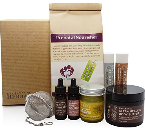 Give a pregnant woman the gift of luxurious, natural, and balanced self care. Contains minis of both of our face serums, an unscented body butter, mini unscented body powder, Minty Cocoa and Earl Grey lip balms, 1 oz Touchy Skin Salve, beautifully blended Prenatal Nourisher, loose organic tea by BirthPartnersTea to help support a healthy pregnancy and birth. Prenatal Nourisher Tea: Lemon Balm, Raspberry, Nettle, Oatstraw, Alfalfa, spearmint, Rosehips. Ora's Amazing Herbal (OAH) Base Oil: Grapeseed Oil (Non-Gmo) Infused With Calendula officinalis (calendula), Symphytum officinale (comfrey), Plantago major (Plantain), Stellaria media (Chickweed), Hypericum perforatum (St. John's Wort), Arctium lappa (Burdock), Thymus vulgaris (Thyme). Advanced Nightly Phytonutrient Face Serum: OAH Base Oil (see above) *Prunus armeniaca (Apricot) Kernel Oil, Limnanthes alba (Meadowfoam) Oil, *Calophyllum inophyllum (Tamanu) Oil, *Rosa canina (Rosehip) Oil, Unica granatum (Pomegranate) Oil, Daucus carota (Carrot) Essential Oil. Lightweight Daily Nourish: OAH base oil, *Prunus armeniaca (Apricot) Kernel Oil, Limnanthes alba (Meadowfoam) Oil, *Olea europaea (Olive) Oil, *Rosa Canina (Rosehip) Oil. Touchy Skin Salve: OAH base oil, Licorice Root, Castor Oil, *Coconut Oil, Beeswax, Vitamin E. Unscented Body Butter Ingredients: *Butyrospermum parkii (Shea Butter) , OAH Base Oil, *Prunus armeniaca (Apricot) Kernel Oil, Limnanthes alba (Meadowfoam) Oil, *Rosa canina (Rosehip) Oil, Ricinus communis(Castor) Oil. *= organic. All herbs are organic. Unscented Body Powder Ingredients: Kaolin Clay Powder, Sodium Bicarbonate(Baking Soda), Maranta arundinacea(Arrowroot) Powder, Plantago major (Plantain) leaf Powder. Lip Balm: OAH Base Oil, *Coconut Oil, Vitamin E, Minty Cocoa: *Fair Trade Cocoa Powder, Essential Oils Of Spearmint And Eucalyptus. Earl Grey: Essential Oils Of Bergamot and Mandarin Orange.Feature