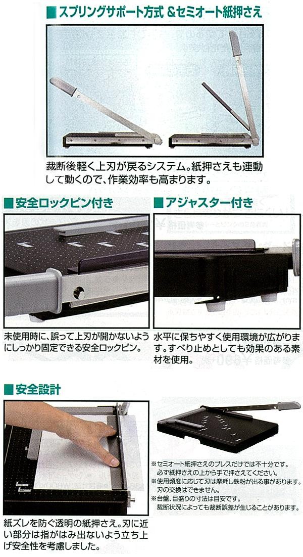 約10枚裁断可能です。裁断後軽く上刃が戻るシステム。紙押さえも連動して動くので、作業効率も高まります。 |