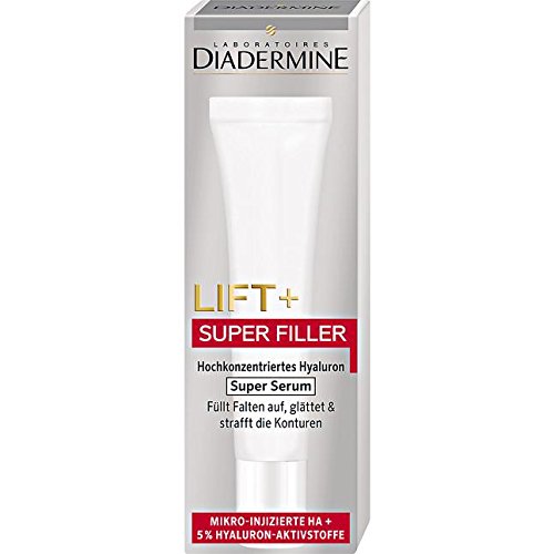 -. Binding : Health and Beauty -. Brand : Diadermine -. EAN : 4015001013672 -. Feature : Very Fast delivery / The first anti-age care of DIADERMINE, as effective as a hyaluron injection * (* Clinically proven compared to a hyaluronic injection in 6 weeks of combined use of DIADERMINE LIFT + SUPERFILLER Day Cream and DIADERMINE LIFT + SUPERFILLER Super Serum.) / LIFT + SUPERFILLER Super Serum combines 2 types of hyaluronic acid: The micro-injected hyaluronic acid (HA) consists of microcapsules that penetrate into the skin like an injection to repel wrinkles from the inside. 5% hyaluronic actives provide the skin with hyaluronic acid for up to 24 hours to smooth the skin - all day long. / VISIBLE RESULTS: The skin is padded from inside, appears smoothed, youthful and radiant-fresh. / The anti-aging innovation LIFT + SUPERFILLER Super Serum offers a highly effective alternative from the tube for professional hyaluron injection. For visible results, apply the LIFT + SUPERFILLER Super Serum daily after cleansing and before the day or night care. -. IsAdultProduct : 0 -. Label : Diadermine -. Manufacturer : Diadermine -. Model : DSUFS -. MPN : DSUFS -. PackageQuantity : 1 -. PartNumber : DSUFS -. ProductGroup : Beauty -. ProductTypeName : BEAUTY -. Publisher : Diadermine -. Studio : Diadermine -. Title : Genuine Diadermine Lift + Super Filler Highly concentrated Hyaluron Super Serum 1.0 oz. / 30ml