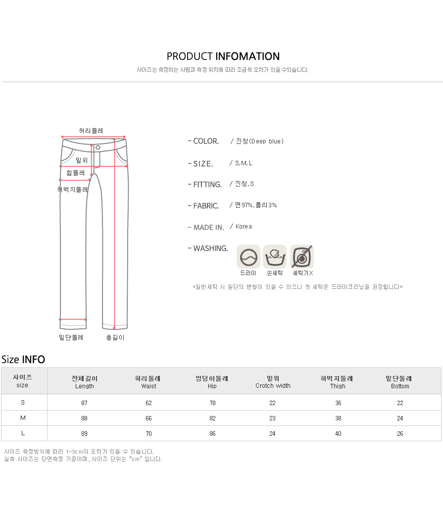 컬러는 진청 1컬러에 S,M,L 사이즈