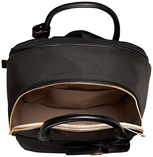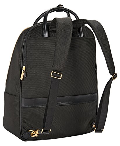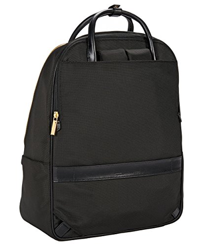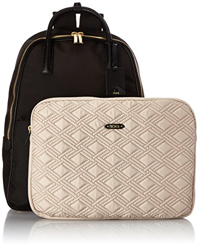 - Feature : Off-set flap pocket with magnetic lock closure, laptop compartment, leather top carry handle, side pouch pockets, leather luggage tag / Media pocket, jewelry pocket, multiple open pouch pockets, 2 pen sleeves, 14 inch quilted laptop compartment / 5.75 x 12.5 x 16 / Two interior zipper pockets and three slip pockets. One exterior zipper pocket, two exterior slip pockets and one magnetic snap pocket. / Includes a laptop case.