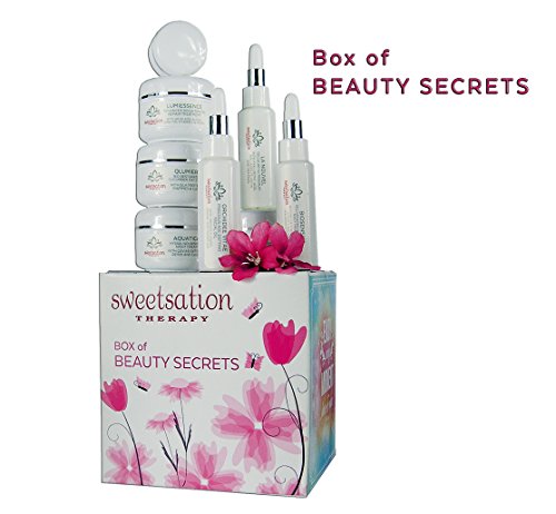 -. Title : Sweetsation Therapy Box of Beauty Secrets. Travel collection of 8 Key Products. Facial Hyaluronic acid Serum, Facial Oil, Multi Vitamin Serum, Anti aging moisturizer, Eye cream.