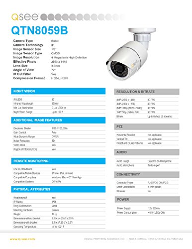 -. Binding : Electronics -. Brand : Q-See -. EAN : 0763598921446 -. Feature : (2-pack) 4MP (2560x1440 pixels) HD IP Security Bullet Camera each with 100ft Cat5e Network Cable / With IP66 rating makes these cameras perfect for indoor or outdoor use. 3-axis mounting point and durable housing prevents vandalism and impacts from the elements. / H.265 Video Compression and 30 IR LEDS providing up to 100 ft. Night Vision / Supports Q-See Series QT IP NVR's that are compatible with QTN HD IP Cameras. / Power over Ethernet (PoE): Technology that allows you to connect to your network and power your camera with a single cable -. Label : Digital Peripheral Solutions -. Manufacturer : Digital Peripheral Solutions -. MPN : QTN8059B-2 -. PackageQuantity : 1 -. PartNumber : QTN8059B-2 -. ProductGroup : Photography -. ProductTypeName : SURVEILANCE_SYSTEMS -. Publisher : Digital Peripheral Solutions -. Studio : Digital Peripheral Solutions -. Title : Q-See QTN8059B 2-pack 4MP/1080p H.265 HD IP Bullet Security Camera (White) -. UPC : 763598921446