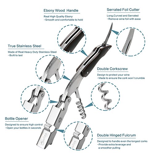 -. Feature : Natural Full Ebony Handle.Premium 420 stainless steel. / Double hinged fulcrum. Double corkscrew. Serrated foil cutter. / Polished finish.All-in-one Wine Opener and Bottle Opener. / We personally tested this corkscrew over 10,00 times to ensure its reliability, dependability,and usefullness. The excellent craftsmanship and detailed work makes this corkscrew the choice of sommeliers, waiter's and bartenders. / LIFETIME WARRANTY:If there are any issues with your purchase you can simply return your product and will be issued with a full refund or a replacement unit at any time,for any reason,no questions asked.
