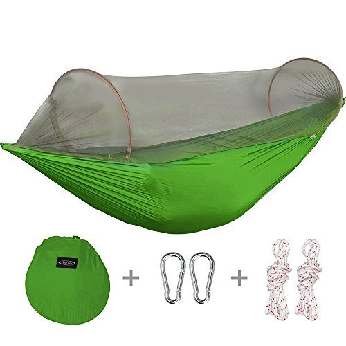 -. Feature : TOP QUALITY CAMPING HAMMOCK - Quick drying parachute nylon. Mildew and rot resistant. / BEST TRAVELER HAMMOCK - Weighs just 28oz, but with the weight capacity of 440lbs,foldable into a small attached stuff sack (13 x 11.8 inches). Fits in any sized backpack. Ideal for short or long-term traveling, jungle expeditions or hiking, backpacking, backyard, outdoor and indoor. / BIG HAMMOCK CAMPING BED - Total hammock length is 118 inches - bed dimensions are 110 inches long and 50 inches wide. ly comfortable for 1 large adult with plenty of space to stretch out or move when sleeping. / SAY NO TO BUGS - No-see-um Mosquito mesh provides you protection against even the smallest bugs. Other hammocks leave you unprotected. / MULTIFUNCTION: ① Used as a normal hammock while putting mosquito net on the bottom; ② Used as a small house by setting up the Mosquito net; ③ Used as a sleeping bag together by putting it on the ground.