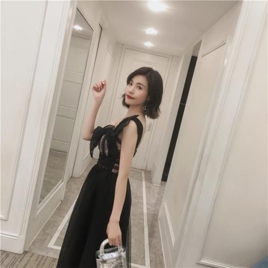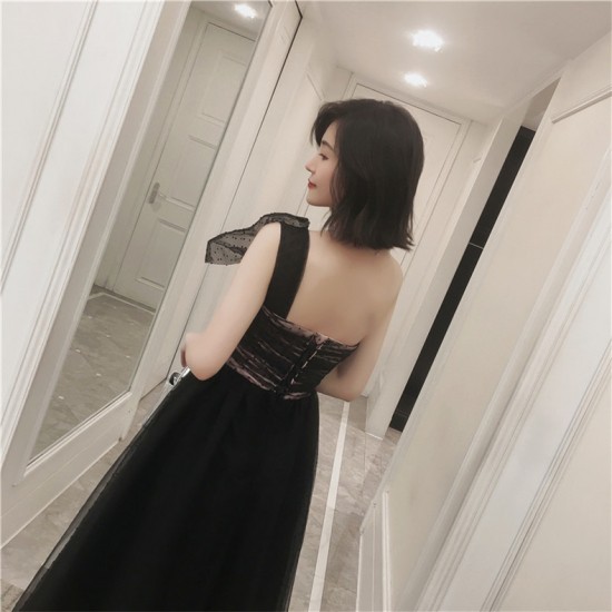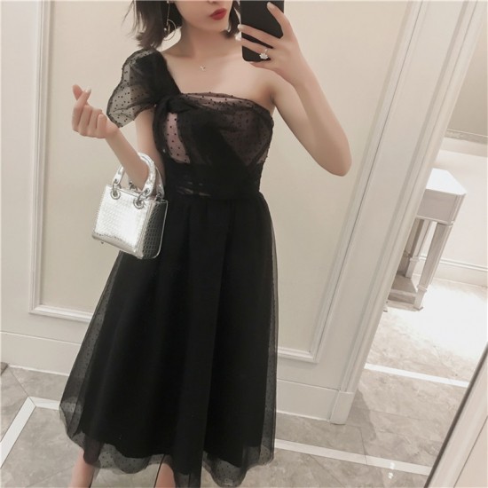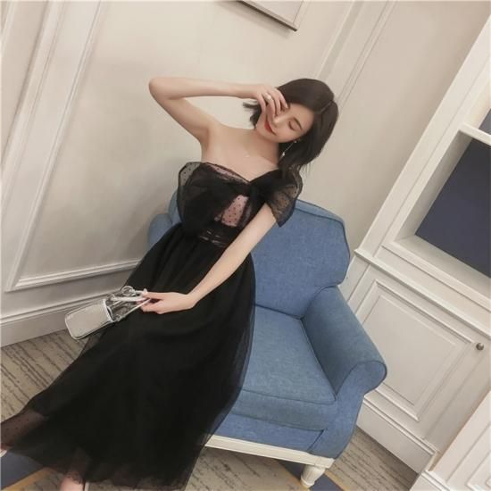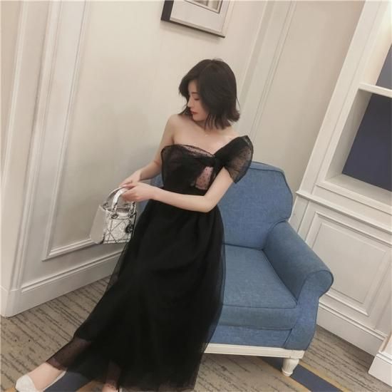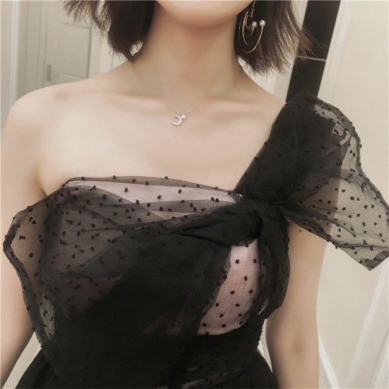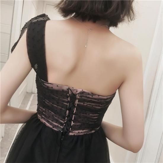 パーティードレス ロング丈 ワンショルダー ブラック チュール リボン ドット柄 透け感 フェミニン 可愛い お呼ばれ drgz2727