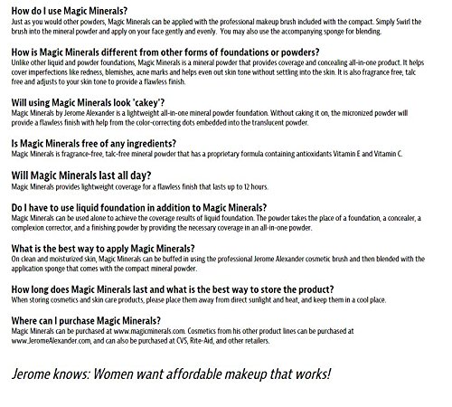 Magic Minerals by Jerome Alexander is what women really want! It covers, conceals and corrects all at once for a flawless look! This ultra-fine micronized mineral powder is so smooth and light, it naturally diminishes the appearance of age spots, dark circles and uneven skin tone without caking or getting caught in wrinkles. This All-in-One self correcting mineral powder is a foundation, corrector and concealer for flawless looking skin with unique built in color correctors that hide skin imperfections instantly and delivers results with no mess. Unlike the loose mineral powders popular today, Magic Minerals by Jerome Alexander is a pressed powder alternative delivering amazing coverage plus healthy looking and glowing skin. Since its initial debut, the new and improved Magic Minerals formula now contains antioxidants and vitamins C & E. Also, it is hypoallergenic, has no irritants and is talc and fragrance free. Set includes, powder compact with mirror, professional stubby brush, blending sponge.Feature
