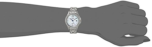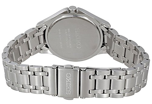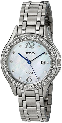 Seiko SUT311 Core solar women's watch features a 29mm wide solid stainless steel case with Swarovski crystals accented fixed bezel and textured push-pull crown. Seiko SUT311 is powered by light energy with a Japanese V137 solar quartz movement. This beautiful watch also features a white mother of pearl dial with blue luminous hands and dot hour markers along with the 6-month power reserve once fully charged and date display functions, scratch resistant hardlex crystal and water resistant to 30 meters. Seiko SUT311 is equipped with a 13mm wide solid stainless steel bracelet with fold over push button clasp. Seiko SUT311 women's Core solar Swarovski crystals MOP dial steel bracelet power reserve watch is brand new and comes in an original Seiko gift box and is backed by a 3 year for USA and 1 year international store limited warranty.Feature