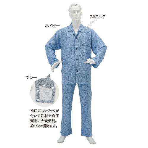 | 前立てと袖口は、ボタンの代わりに丸型マジックを使用しており、注射や血圧測定に大変便利です。約19cm開きます。 |