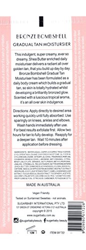 This indulgent, super creamy, ever so dreamy, Shea Butter enriched daily moisturizer delivers a radiant all over golden tan, that you build up day by day. Bronze Bombshell Gradual Tan Moisturizer has been formulated as a daily body cream which builds a gradual tan, so skin is totally hydrated whilst developing a brilliantly bronzed glow. Scented with a luscious tropical aroma, it's an all over skin indulgence.Feature