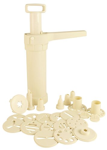 - Set includes 12 different cookie discs, 2 two-toned cookie discs, 1 pasta disc, 1 macaroon disc, 6 decorating nozzles, recipes and complete instructions