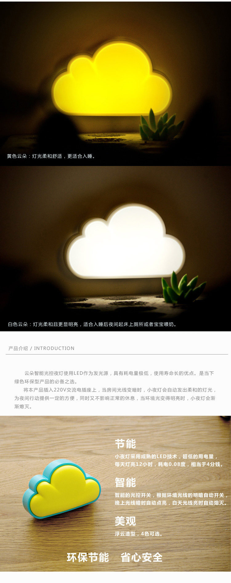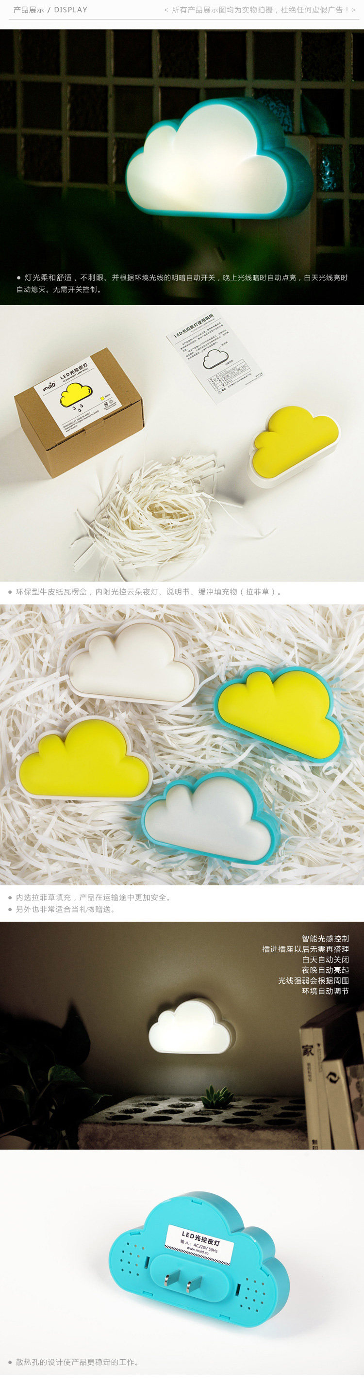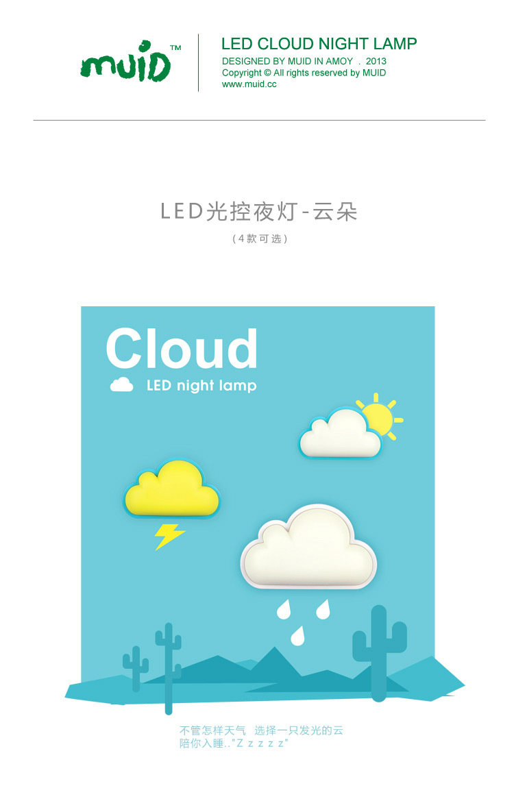 Use nightlights clouds intelligent light control LED as the light source, with low power consumption, long life advantages, is the moment