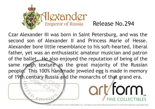 -. Binding : Misc. -. Brand : Objet d' Art -. EAN : 0845277002537 -. Feature : Made 100% by hand by expert metal handicrafters. / Beautifully boxed and includes certificate of authenticity, presentation gift card with matching envelope. / A beautiful, tasteful collectible. A gift worth giving and keeping for a lifetime. / Hand applied authentic Austrian crystal and European lacquers. / Part of the huge collection of jeweled trinket boxes from Artform Fine Collectibles. -. Label : Artform, LLC -. Manufacturer : Artform, LLC -. Model : AFOA10084 -. MPN : AFOA10084 -. PackageQuantity : 1 -. PartNumber : AFOA10084 -. ProductGroup : Home -. ProductTypeName : HOME -. Publisher : Artform, LLC -. Studio : Artform, LLC -. Title : Objet D'Art Release #294 "Alexander III Emperor Of Russia" Faberge Styled Egg Handmade Jeweled Enameled Metal Trinket Box -. UPC : 845277002537 -. Warranty : 90 day warranty against manufacturer defects