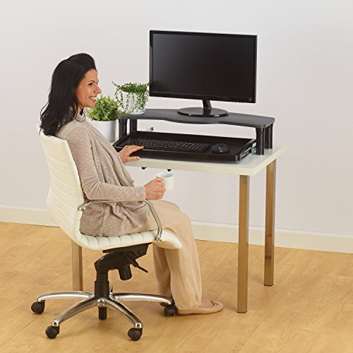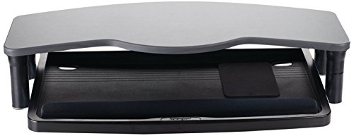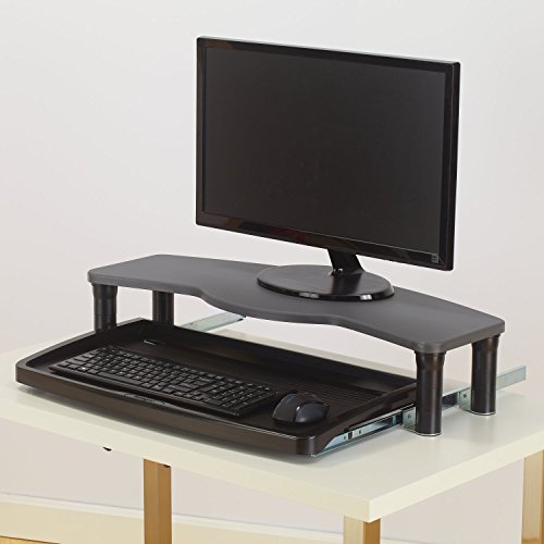 -. Feature : Fits all size keyboards, including oversize and natural-shaped models / Easy-to-install extension legs adjust height for viewing comfort / Extra-wide tray with room for oversized keyboards and integrated mousing area / Shelf raises monitor for improved position with keyboard and mouse storage / SmartFit(TM) system lets you quickly and easily set your optimal viewing height.