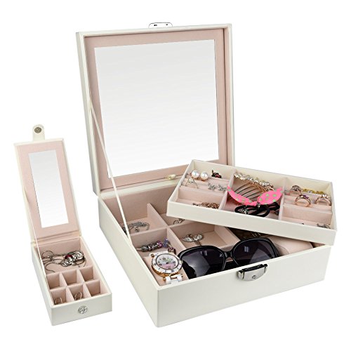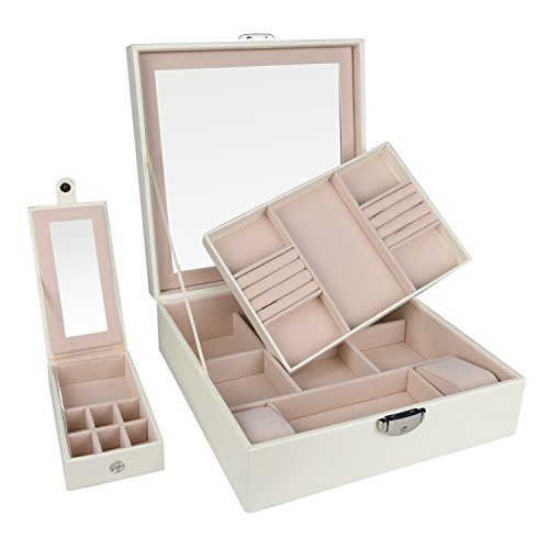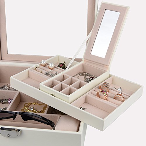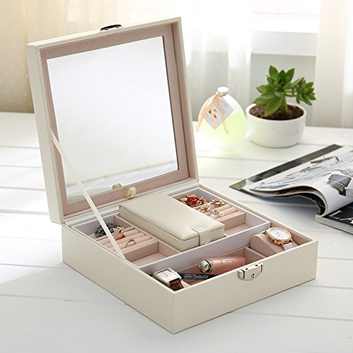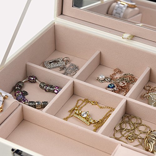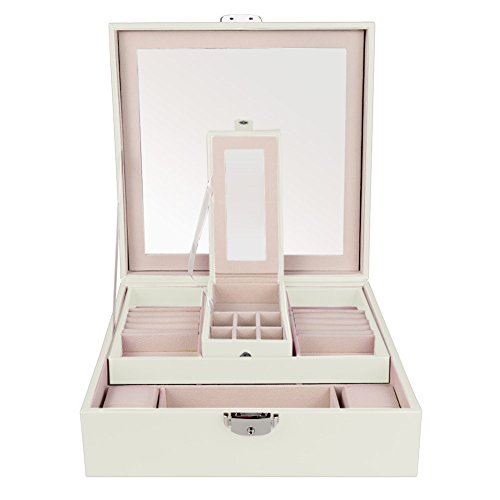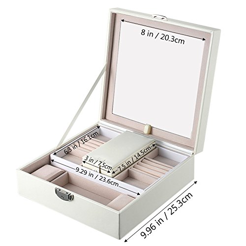 Goldwheat Jewelry Box Case PU Leather Travel Jewelry Organizer Lockable Storage Box Gift for Women with Large Mirror and Removable Trays Case(White)