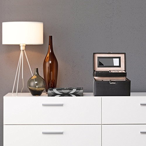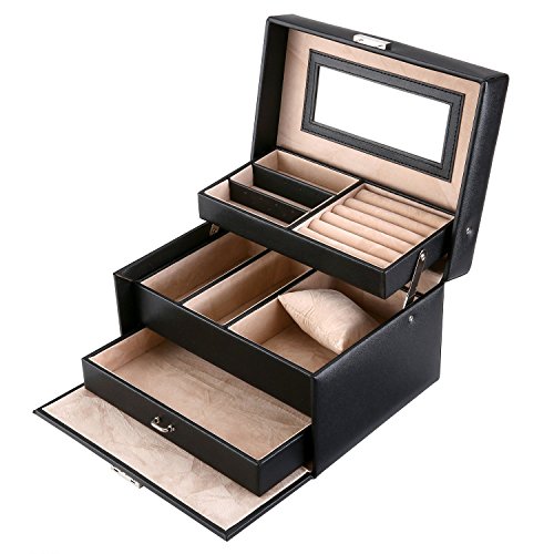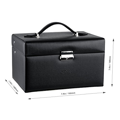 Jewelry Box, Kealive Portable Jewelry Case Organizer Mirror Included 3 Layers 1 Drawer with Security Lock for Travel Home Storage 114B Black