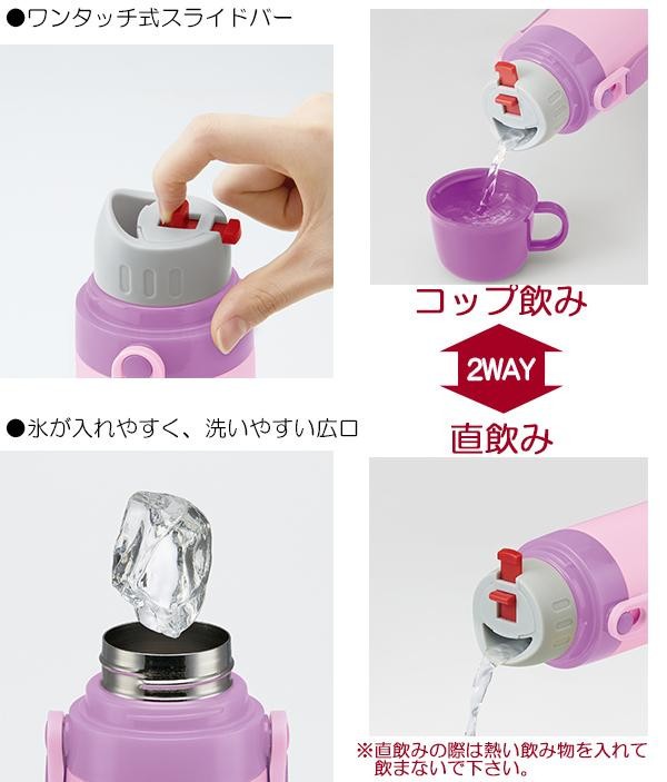 直接口を付けて飲める水筒としても、コップに入れて飲める水筒としても使える2WAYのステンレスボトルです。氷を入れやすい広口タイプで、ワンタッチ式のスライドバーで飲み方をお選びいただけます。 |