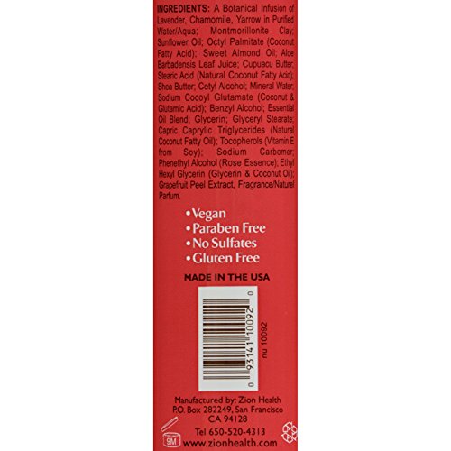 Other Ingredients: A Botanical infusion of Lavender, Chamomile, and Yarrow in purified water, Calcium Montmorillonite Clay, Sunflower Oil, Octyl Palmitate (Coconut Fatty Acid), Beeswax, Sweet Almond Oil, Aloe Barbadensis Leaf Juice, Cupuacu Butter, Stearic Acid (Natural Coconut Fatty Acid), Shea Butter, Cetyl Alcohol, Mineral Water, Sodium Cocoyl Glutamate (Coconut & Glutamic Acid), Benzyl Alcohol, Essential Oil Blend, Glycerin, Glyceryl Stearate, Capric Caprylic Triglycerides (Natural Coconut Fatty oil), Tocopherols (Vitamin E from Soy), Sodium Carbomer, Phenoxyethanol (Rose Essence), Ethyl Hexyl Glycerin (Glycerin & Coconut Oil), Pink Grapefruit Natural Fragrance (Fragrance will slowly dissipate once bottle is open)