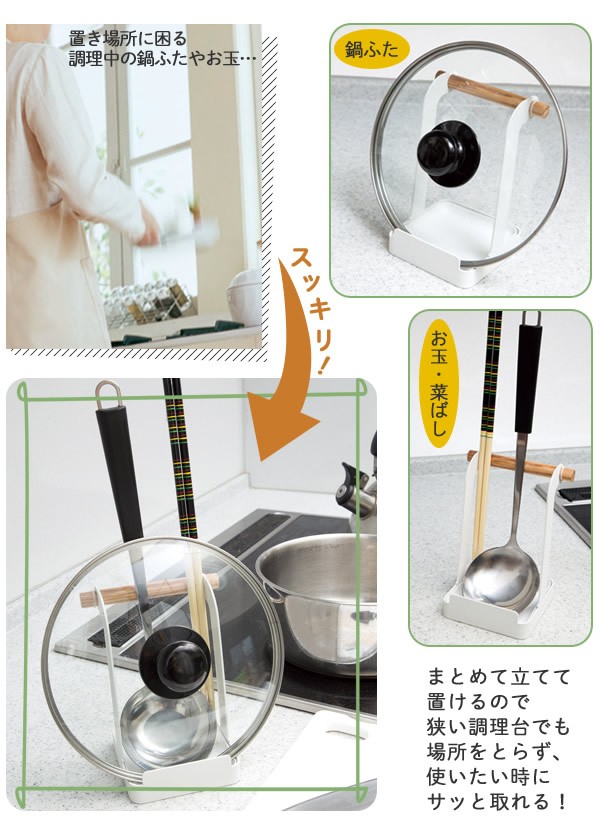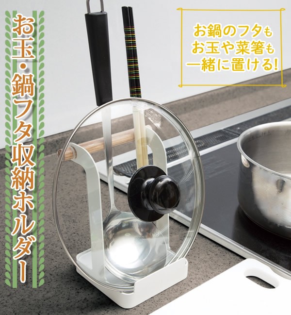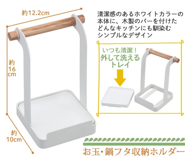 | お鍋のフタ・お玉・菜ばしが一緒に置ける!お玉・鍋フタ収納ホルダー。狭い調理台でも場所を取らずにスッキリ置け、使いたい時にサッと取れます。清潔感のあるホワイトカラーの本体に木製のバーを付けた、どんなキッチンにも馴染むシンプルなデザイン。トレイは外して洗えます。/お玉・鍋フタ収納ホルダー/鍋ぶた置き/鍋ふたスタンド/お玉置き/おたまスタンド/菜箸立て/まな板/タブレット/レシピ/キッチン用品/調理器具/ |