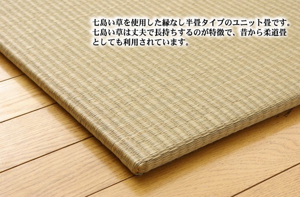 届いたユニット畳を床に置くだけで和のスペースが出来上がります。ヘリの無い、半畳タイプです。表生地には、むかし柔道用の畳にも使用されていた、耐久性の高い中国産の七島イ草を使用しています。また七島イ草は無染土、無着色なので天然素材そのままの美しさがあり、スベスベとした素肌に気持ちの良い感触があります。中材に木製ボードを使用した重量感のある本格タイプです。裏の不織布にはすべり止め加工を施しています。また木製ボードとイ草生地の間にウレタンを使用していますので、ほのかなクッション性があります。