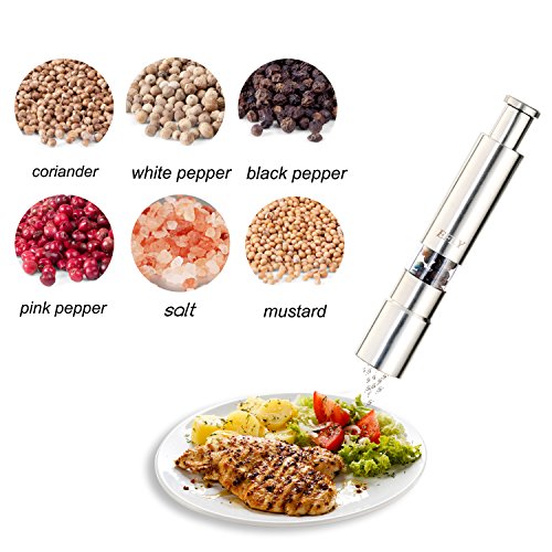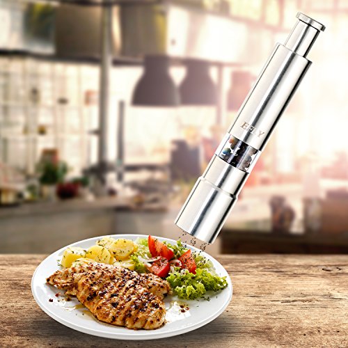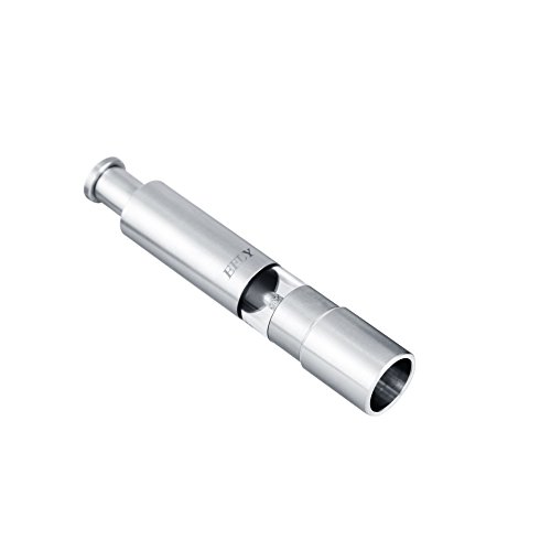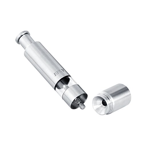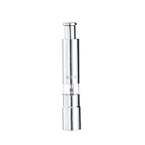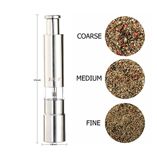 Studio : EFLY Publisher : EFLY Product Description EFLY Thumb-Push Mill is the ultimate multifunctional grinder! Designed for everyday use in any kitchen. Its sleek, modern and unique stainless steel design will catch everyone's eye. Yet, it's durable to meet any kitchen and outdoor use. In addition, you will never need batteries and never run out of power. It's manual one hand operation that grinds the perfect amount of spices every time. A fantastic gift set for any occasion. Order your Grinder now ! Features -Light weight, and easy to use -Heavy duty stainless steel, with transparent acrylic chamber to see the amount of Salt, Peppercorns, or other spices -One hand operation (compact design) -Thumb Push (never need to buy or change batteries) -Perfect for a variety of spices -Maintains freshness We are confident you will be satisfied with our product. We give 100% Satisfaction Guarantee! In the unlikely event your mill is defective, we will replace it at no charge. EFLY manufacture premium products, while enforcing strict quality controls. That's why every one of our grinders carries our laser engraved name elegantly placed on it. DOES NOT COME PRE-FILLED WITH ANY SALT OR PEPPERCORNS. DO NOT OVERFILL. PLEASE USE MEDIUM SIZED PEPPERCORNS OR SEA SALTS 0