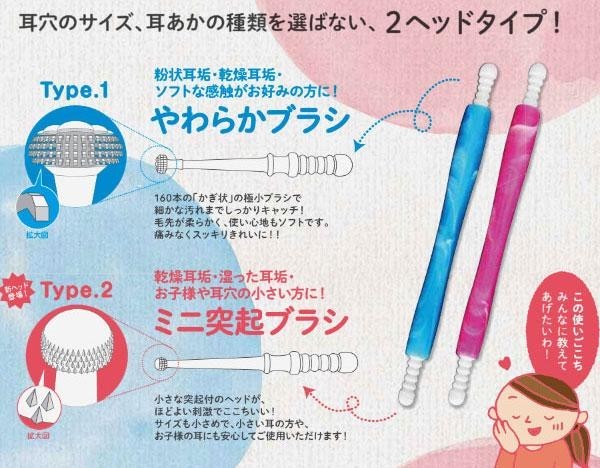耳穴のサイズ、耳あかの種類を選ばない2ヘッドタイプです。Type1は160本のかぎ状の極小ブラシで細かな汚れまでしっかりキャッチしてくれます。粉状耳垢・乾燥耳垢・ソフトな感触がお好みの方におススメです。Type2は小さな突起付ヘッドが、ほどよい刺激で心地良く、乾燥耳垢・湿った耳垢・お子様や耳穴の小さい方におススメです。 |