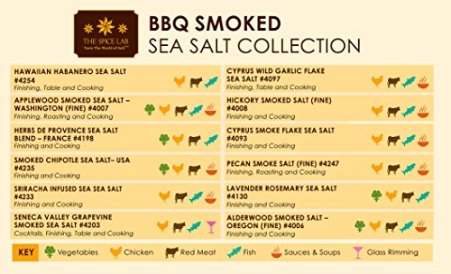 FLAVORS: No. 6 - Alderwood Smoked Salt No. 7 - Applewood Smoked Salt No. 8 - Hickory Smoked Salt No. 97 - Cyprus Wild Garlic Salt No. 130 - Lavender Rosemary Salt No. 198 - Herbes de Provence & Fleur de Sel Blend No. 203 - Smoked Grapevine Salt No. 233 - Sriracha Salt No. 235 - Smoked Chipotle Salt No. 247 - Smoked Pecan Salt No. 254 - Hawaiian Habanero Salt