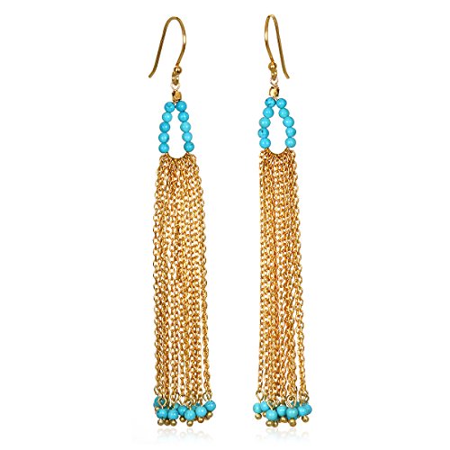 2mm round smooth Turquoise beads dangle in these 3-inch long earrings. 18kt gold-plate over brass.