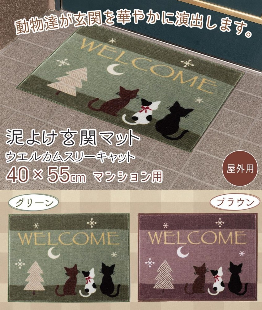 | 落ち着いた色合いと可愛らしいデザインの屋外用玄関マット♪汚れたら水洗いでき、裏面には滑りにくい加工を施しているので横ズレしにくいです。マンションや団地にピッタリサイズ!! |