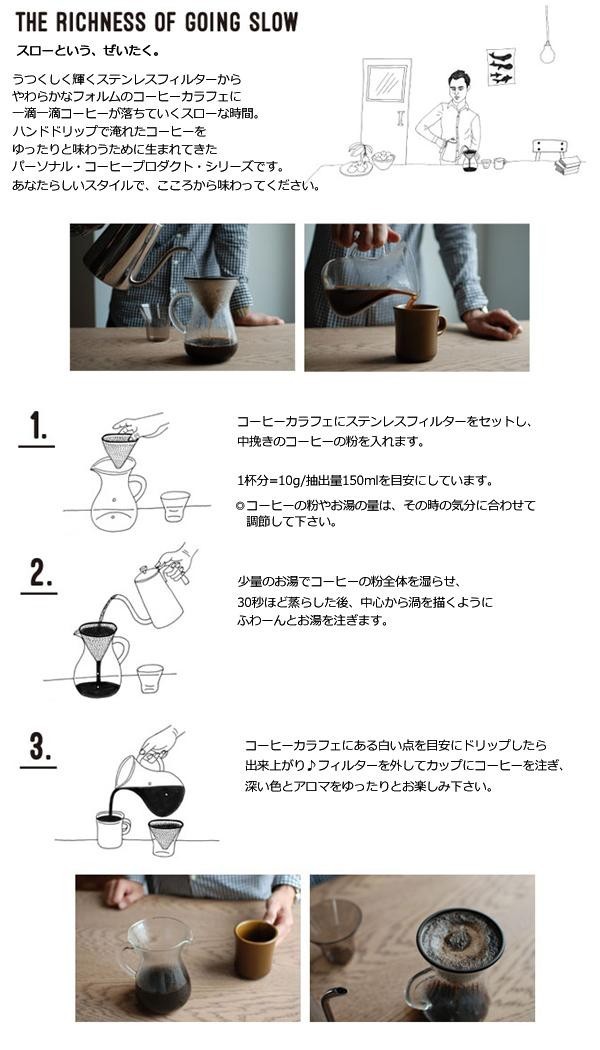 旨み成分であるコーヒーオイルがダイレクトに抽出されるステンレスフィルター付のコーヒーカラフェセット。付属のホルダーは使用後のフィルター置きにお使い頂けます。また、ホルダーには目盛りが付いているので、豆の計量カップとしても使えます。全てのパーツを重ねてコンパクトに収納することができます。 |