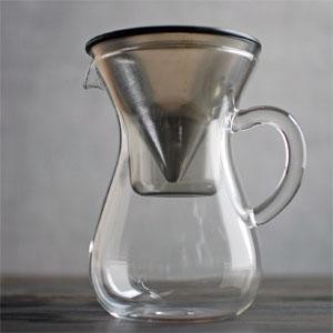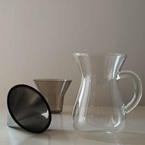 | 旨み成分であるコーヒーオイルがダイレクトに抽出されるステンレスフィルター付のコーヒーカラフェセット。付属のホルダーは使用後のフィルター置きにお使い頂けます。また、ホルダーには目盛りが付いているので、豆の計量カップとしても使えます。全てのパーツを重ねてコンパクトに収納することができます。 |
