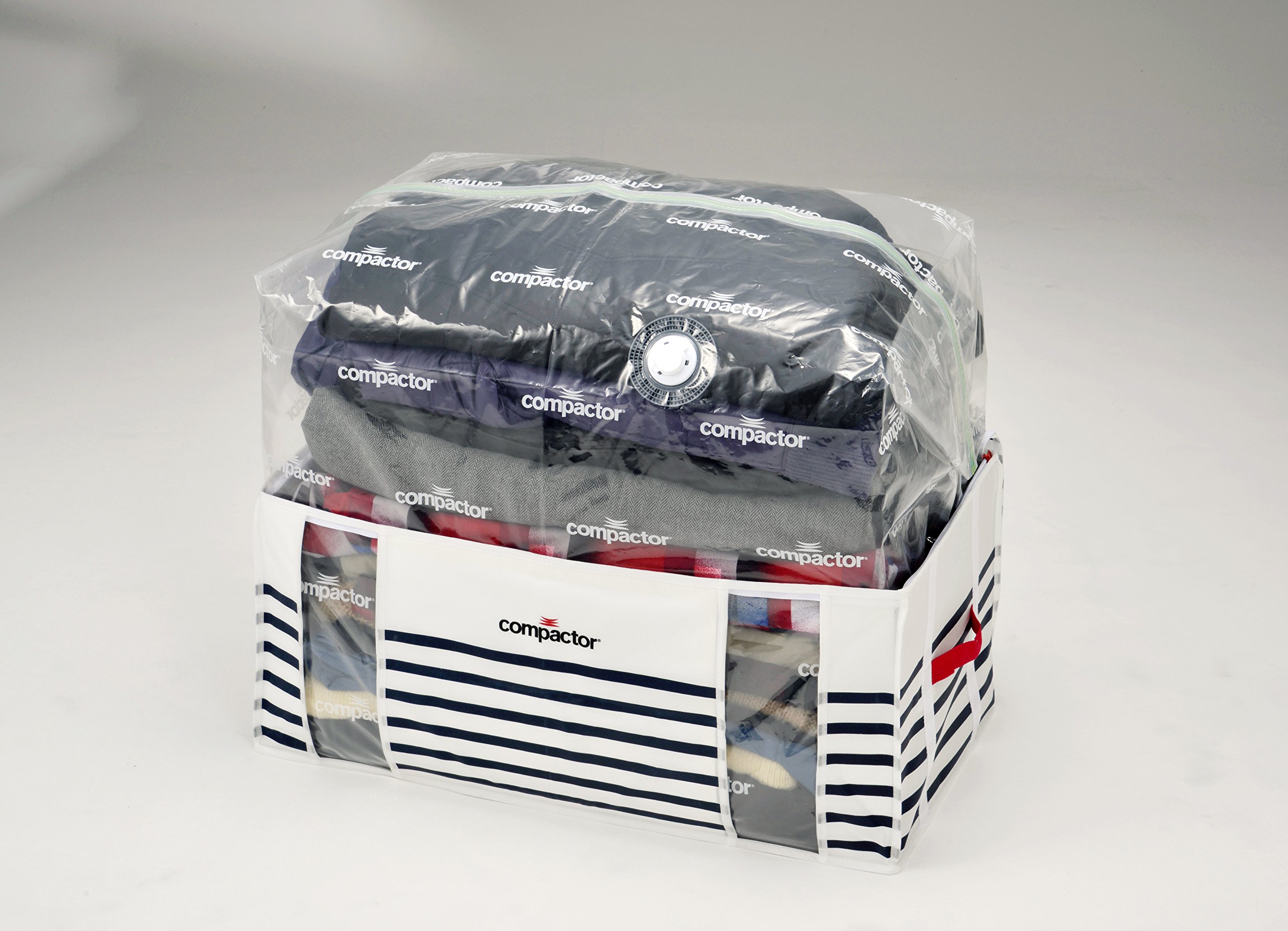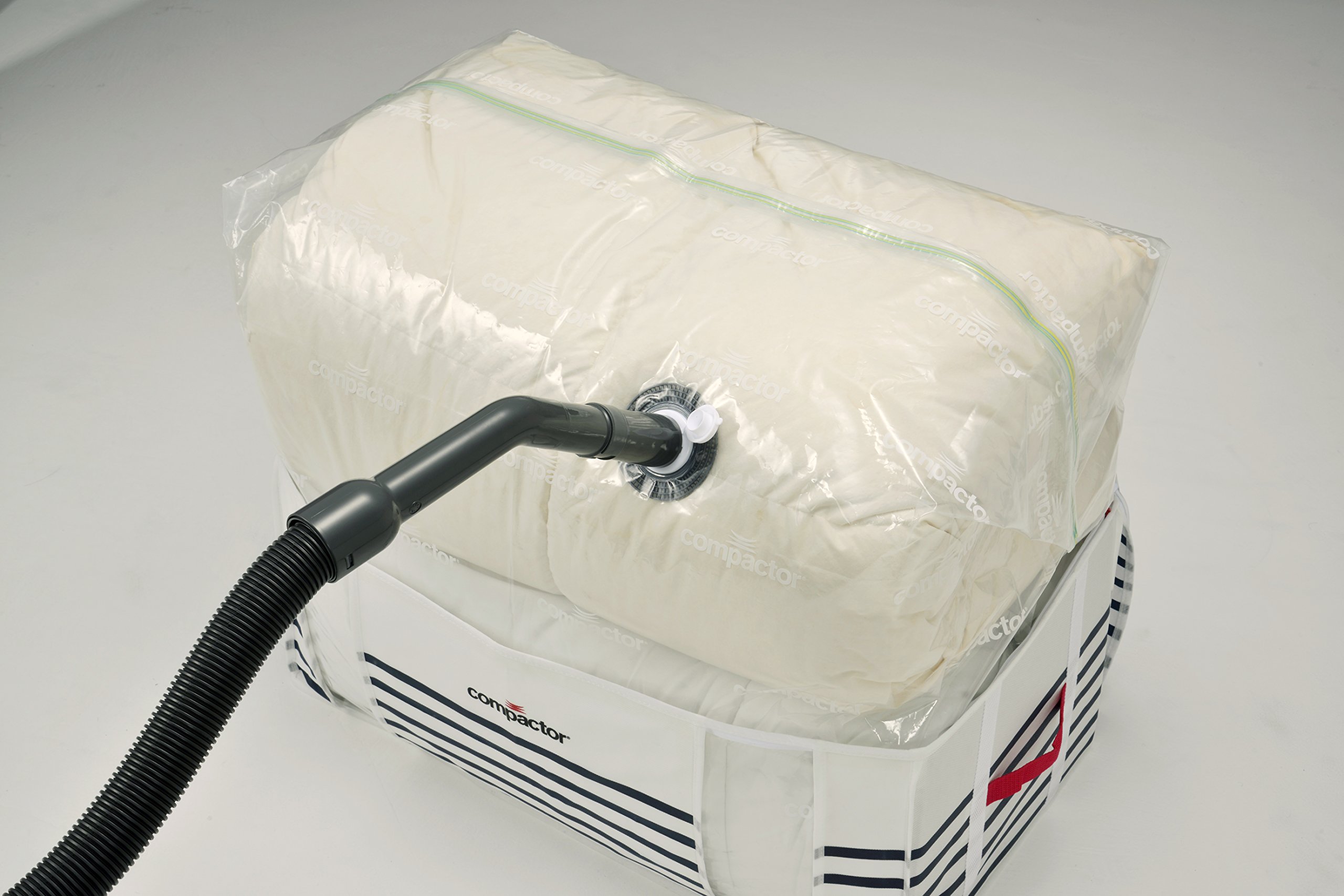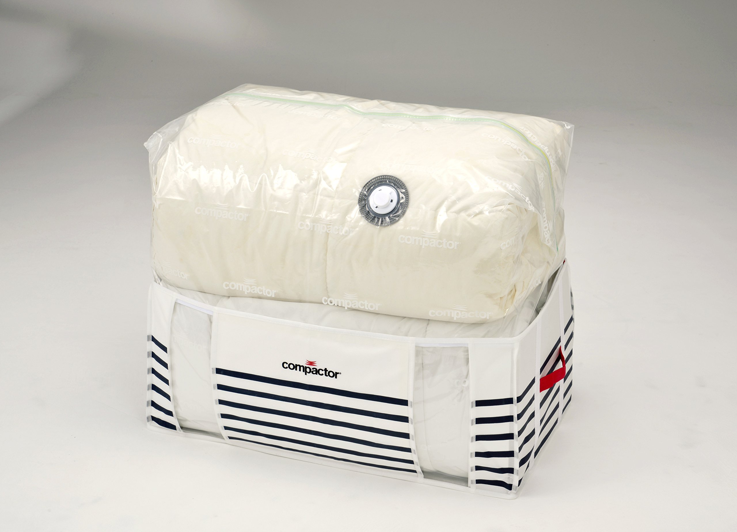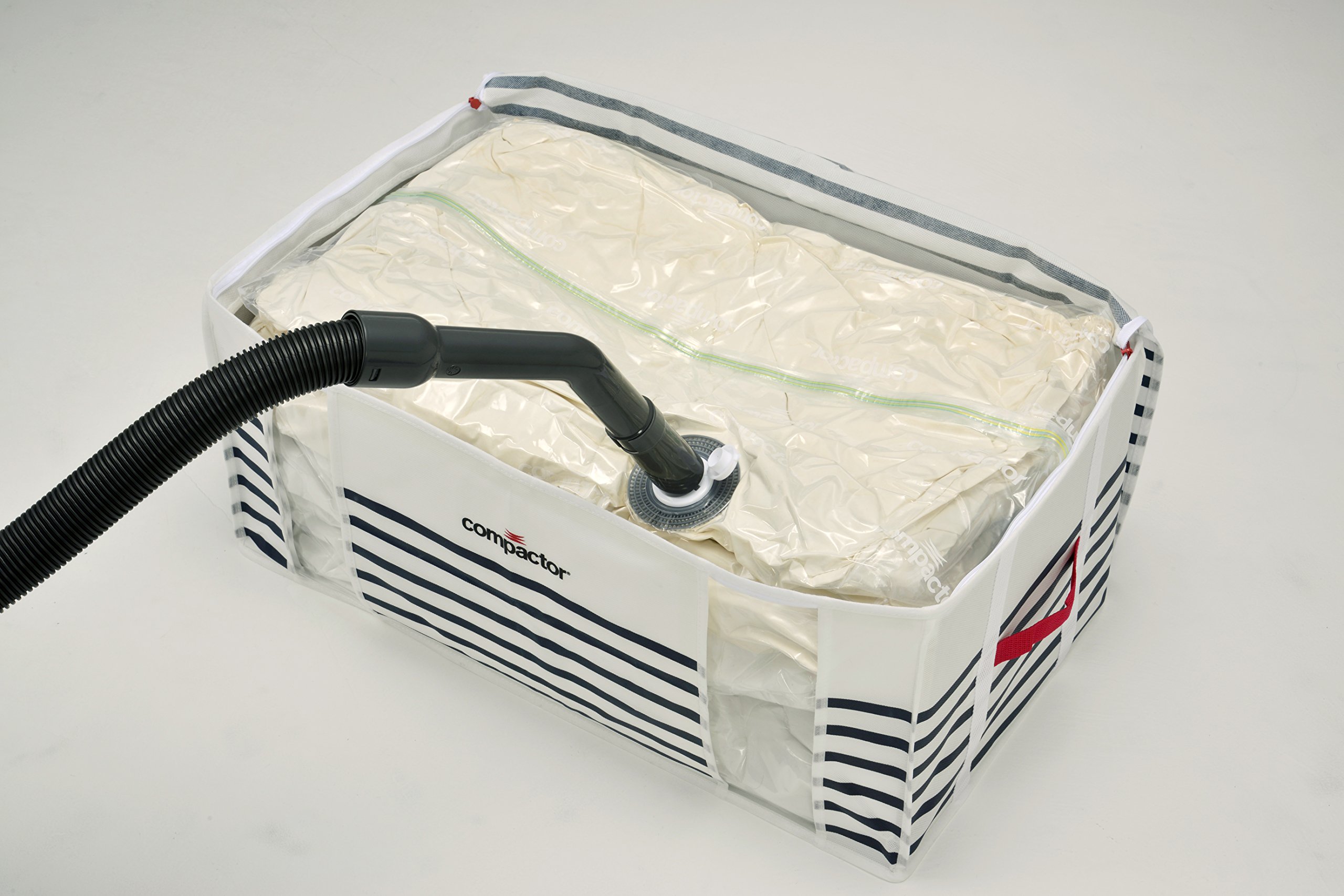 Compression box for closet, with compression bag attached to storage box.