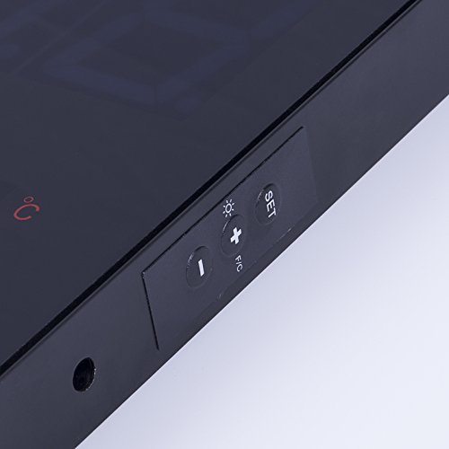 -. Feature : 3 controllers, super easy to set up. Clock size: 14.2x 8.5x 1.0 inches. Time size: 2.3x 1.3 inches. / Display: Time(12/24 hr), Date(mm-dd), Day of the week, Indoor Temperature(C/F). / Brightness Adjustable (3 options). / AC powered (external adaptor, included). Memory function: clock keeps the settings and time running in case of a power failure. / Can be mounted on the wall, or sit against the wall on the desk.