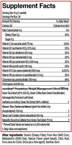 This little stick pack of weight loss powder is designed to provide you with pure vibrant energy, craving control, lower stress levels, reduce appetite and enhanced fat buring. One serving contains 38 calories, 5 grams of fiber and zero sugar. This comes in a natural berry tea flavor and light and refreshing. We recommend children under 12 do not use nanolean because of the caffeine.